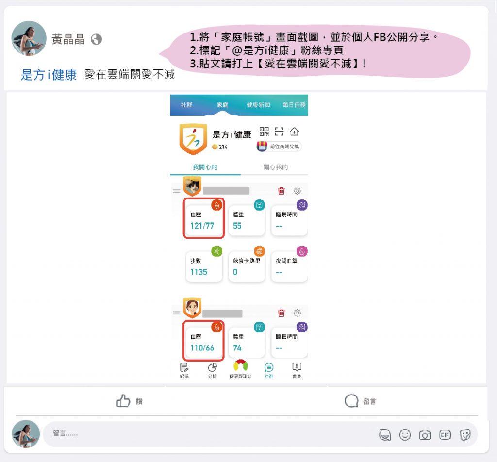 (3) 完成上述任務,將「家庭帳號」畫面截圖(畫面需有家庭成員的血壓數值),並於個人FB公開分享,標記「@是方i健康」並輸入【愛在雲端關愛不減】。