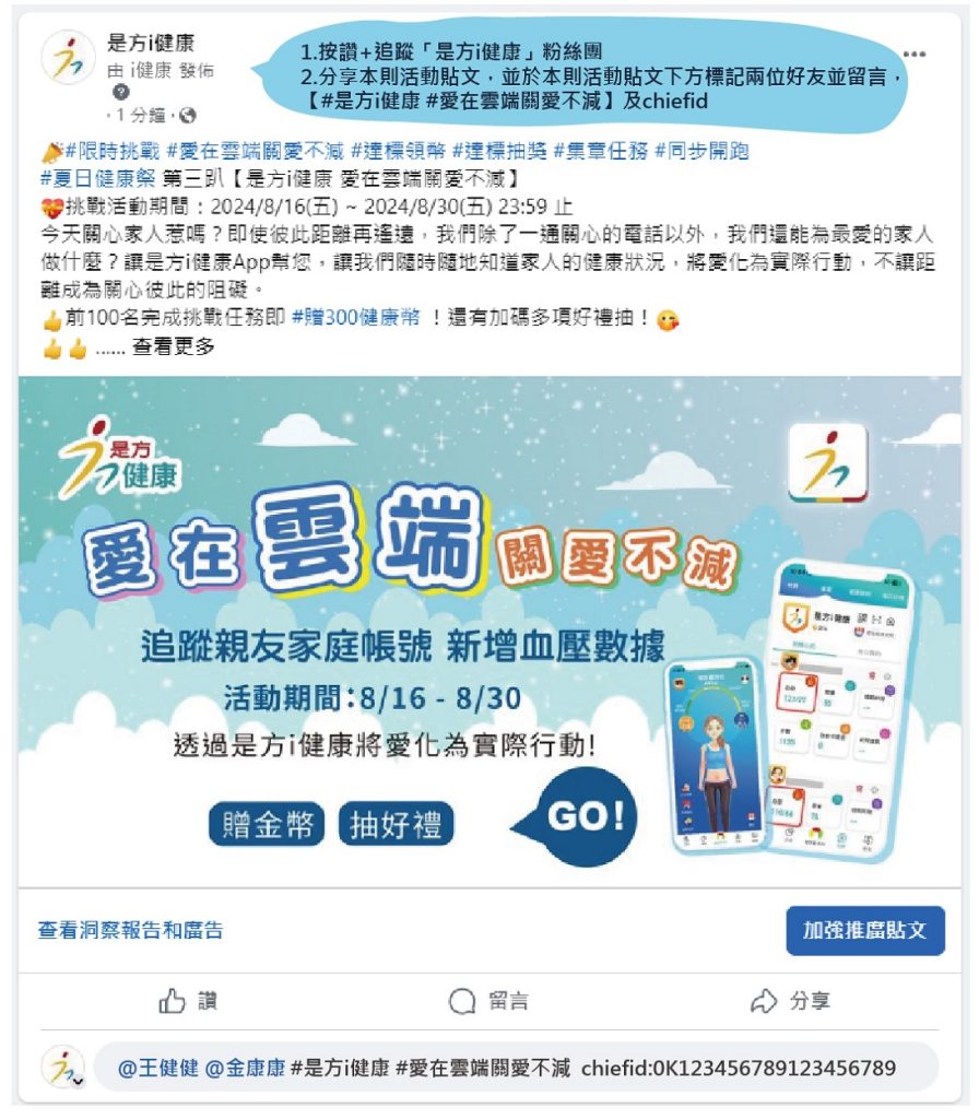 (5) 分享本則活動貼文,並於本則活動貼文下方標記兩位好友並留言【#是方i健康 #愛在雲端關愛不減】及chiefid。