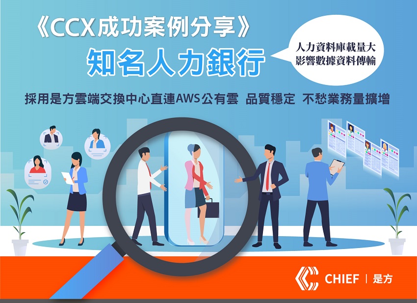 然而,隨著求職者個資不斷地累積,人力資料庫日益龐大,漸而影響數據資料傳輸效率以及資訊安全,國內某知名人力銀行為了同時兼顧人力銀行營運成本與資安的雙重考量,選擇採用是方電訊雲端交換中心服務(Chief Cloud eXchange,簡稱CCX),順利解決目前所面臨的問題。